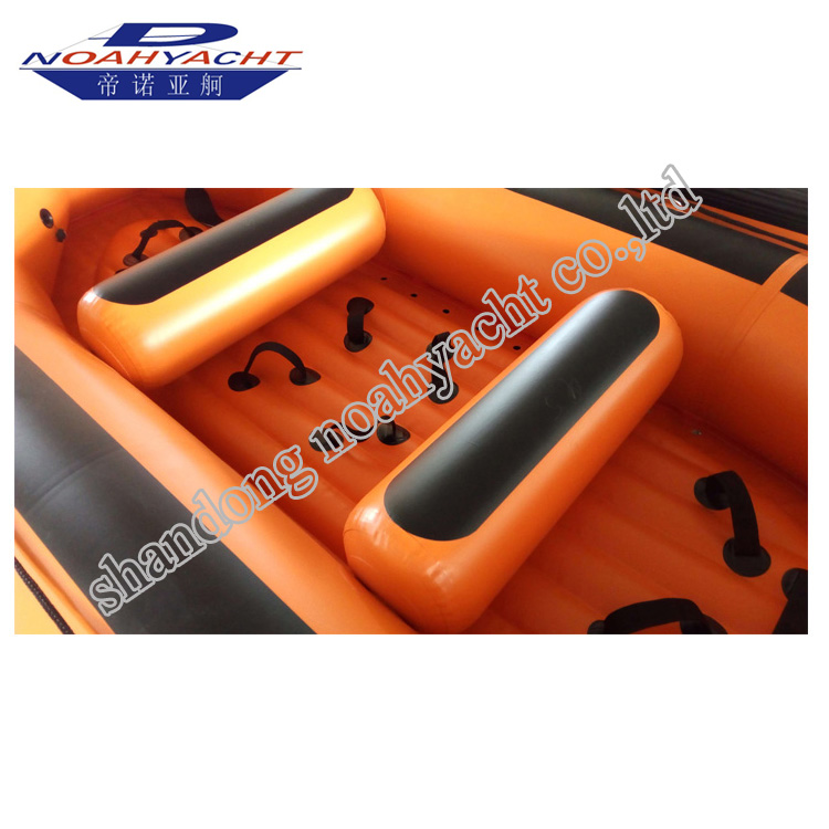 帝诺亚舸漂流船专门为白水级别设计,结实、耐用。浮筒底部额外贴一层PVC料皮加固。自排水充气拉筋地板设计,配套安全阀,保证安全。