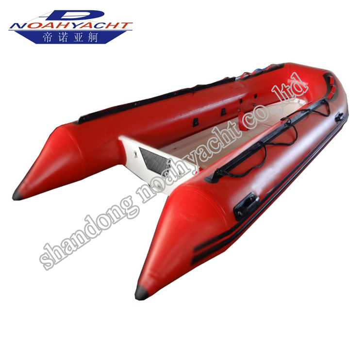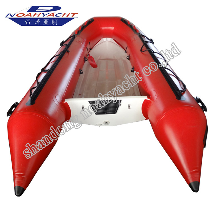 与软底的充气船相比,玻璃钢硬壳底RIB船更加结实耐用,能抗风和极端天气。特别是在有礁石和海蛎子壳等的海滩上优势更明显,底壳坚硬,不易破损,防腐,耐磨,寿命长。此款玻璃钢RIB船甲板宽敞,易于在船上活动及储物。可以用作钓鱼船,救援艇,工作艇等。